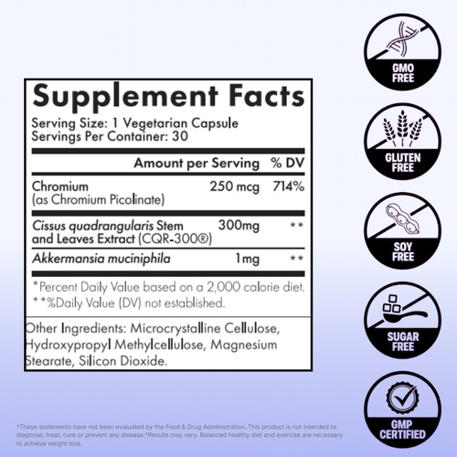 - Cissus Quadrangularis Extract (300 mg, 20% Ketosterones): Supports fat metabolism, enhances GLP-1 activity, and aids in reducing body fat.
