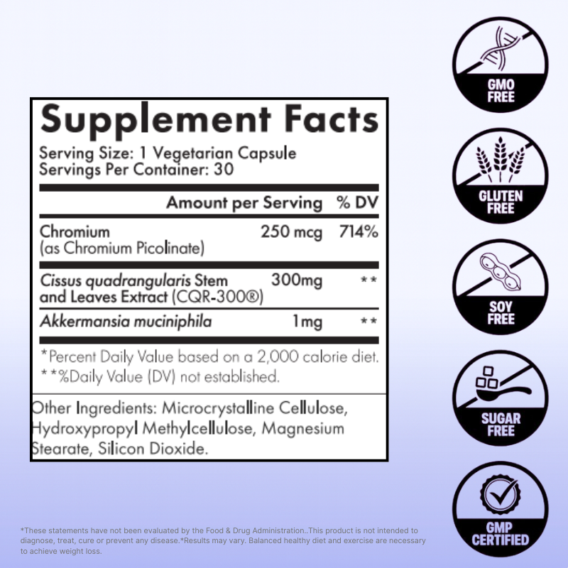 Chromium Picolinate (250 mcg): Helps regulate blood sugar, reduce cravings, and support appetite control.